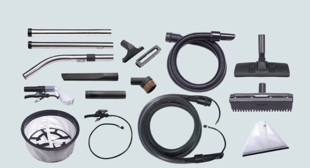 Akcesoria w zestawie: Wąż ssący 2m i 3m, komplet natryskowy, ssawka na sucho, ssawka szczelinowa, ssawka trójkątna, ssawka z włosiem, ssawka do tapicerki, ssawka 150 mm, ssawka do zbierania wody z włosiem, redukcja, szczot
