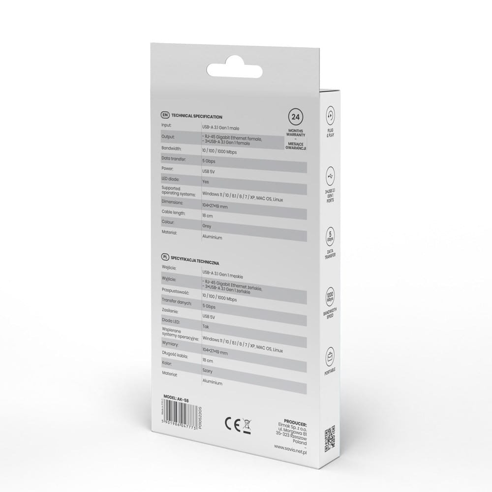 SAVIO AK-58 3-PORTOWY HUB USB-A Z ADAPTEREM RJ-45